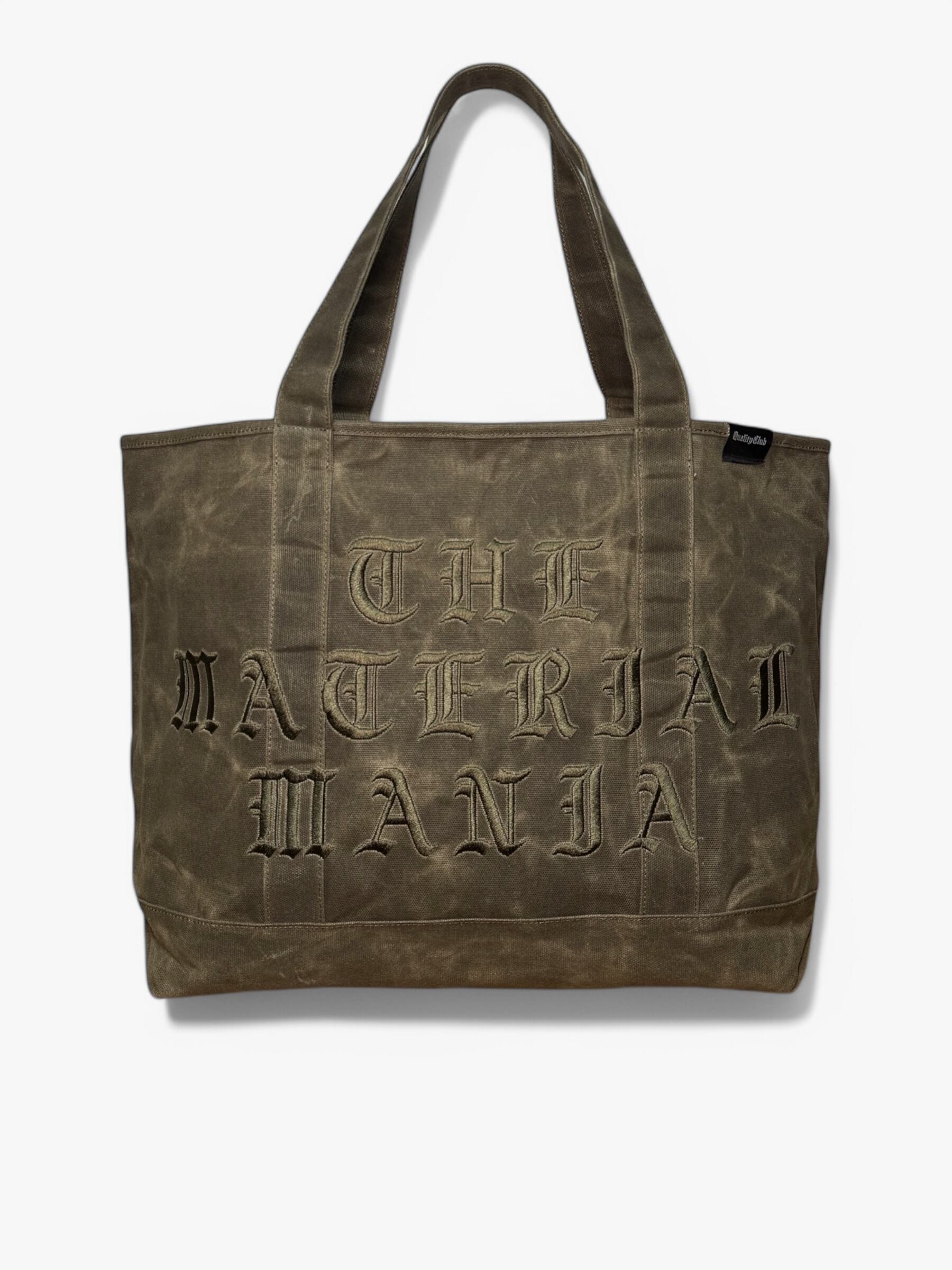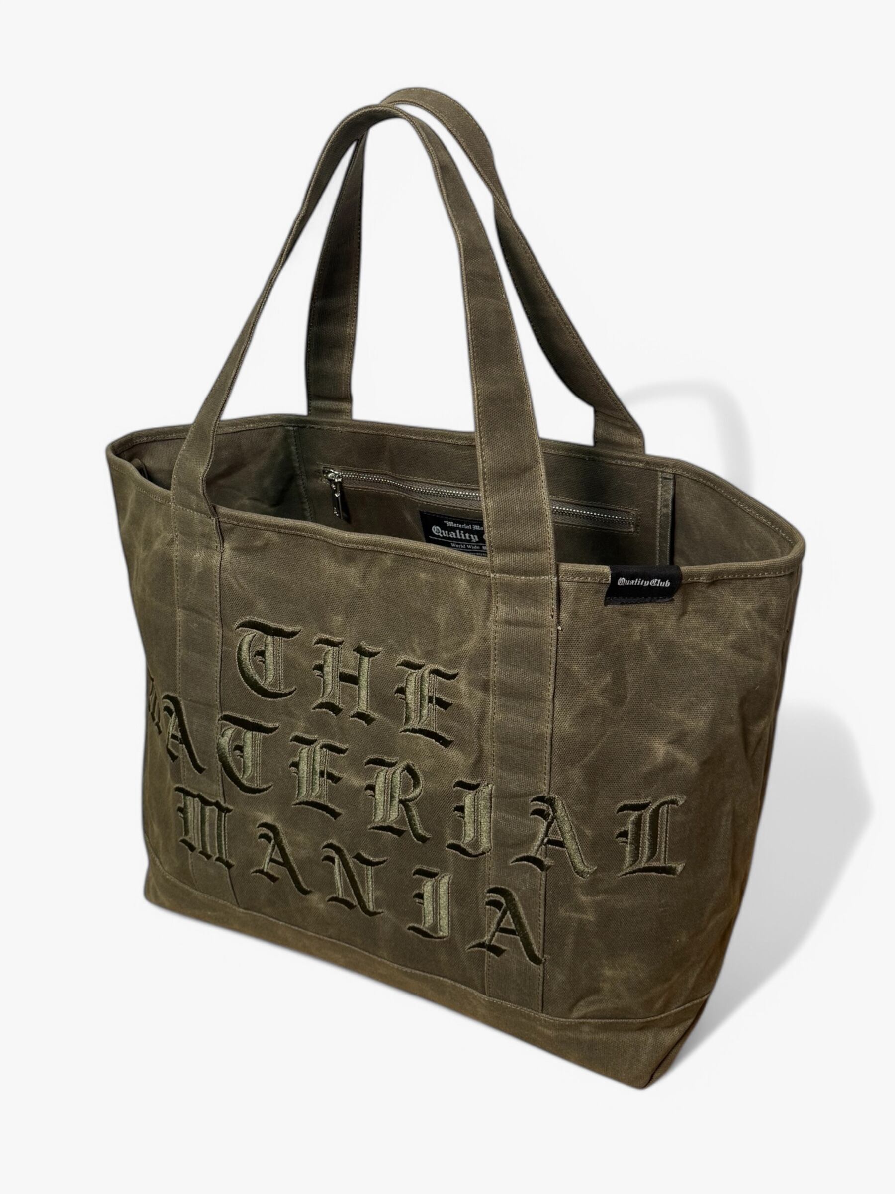 ワックスキャンバスのタフな質感と、立体的な刺繍ロゴが特徴のトートバッグ。素材特有の経年変化を楽しめるデザインで、使い込むほどに味わいが増していく。